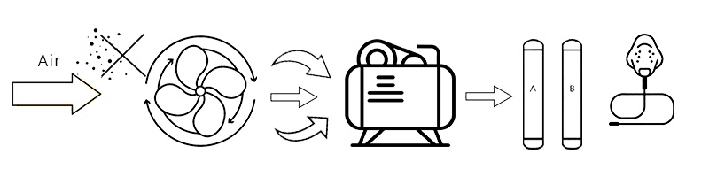 (Output oxygen): High-purity oxygen is fed into a gas tank and then delivered to the user through a flow meter and nasal oxygen cannula.
